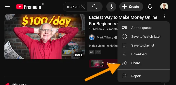 اگر در یوتیوب هستید، با کلیک روی سه نقطه کنار ویدیو، لینک ویدیو را دریافت کنید.