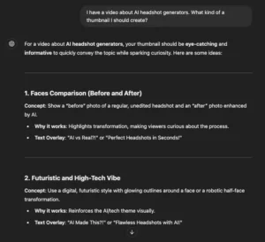 برای مثال، در اینجا من به ChatGPT گفتهام که برای تامبنیل یکی از ویدیوهایم ایده بدهد.