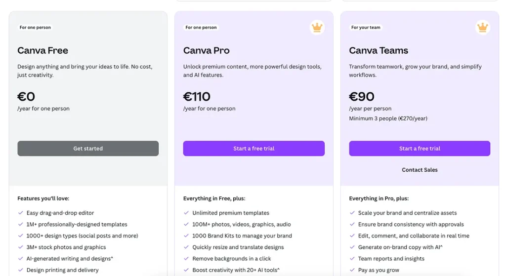 - حرفهای (۱۱۰ یورو در سال): ابزارهای پیشرفته برای افراد – همه چیز در نسخه رایگان به علاوه قالبهای پریمیوم، ۱۰۰ دارایی M+، کیتهای برند، تغییر اندازه، حذف پسزمینه و بیش از ۲۰ ابزار هوش مصنوعی.