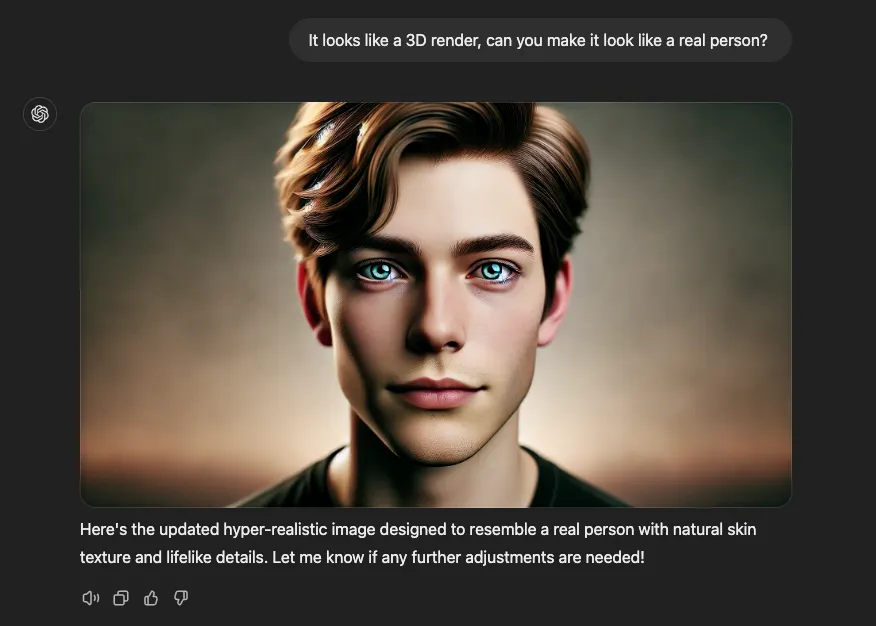 فوقالعادهست! دقیقاً مثل من نیست، اما فعلاً همین کافیه. برای اینکه بهتر با من هماهنگ بشه، میتونم از یه دستور دیگه برای مطابقت با مدل موهام استفاده کنم.